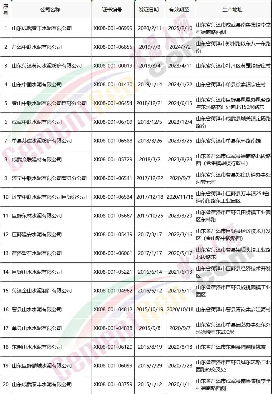 2020年菏泽市获证水泥生产企业名单查询日期:2020年5月26日