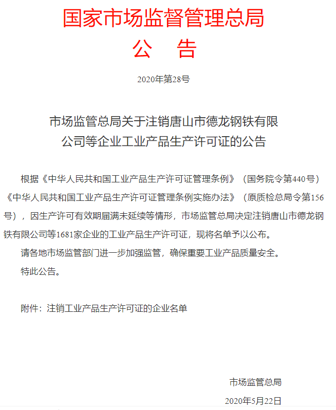 日前,国家市场监督管理总局发布《关于注销唐山市德龙钢铁有限公司等企业工业产品生产许可证的公告》(2020年第28号)称:因生产许可有效期届满未延续等情形,市场监管总局决定注销唐山市德龙钢铁有限公司等1681家企业的工业产品生产许可证,其中注销水泥产品生产许可证共106个编号。