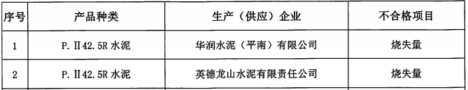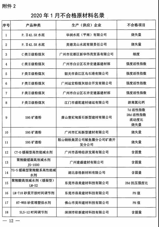 广州市散装水泥管理办公室发布《关于2019年第四季度预拌混凝土、预拌砂浆生产企业质量监督抽检情况的通报》,共抽检水泥190份,不合格4份。其中不合格水泥涉及两家企业,分别为华润水泥(平南)有限公司、英德龙山水泥有限责任公司,不合格项目均为烧失量。