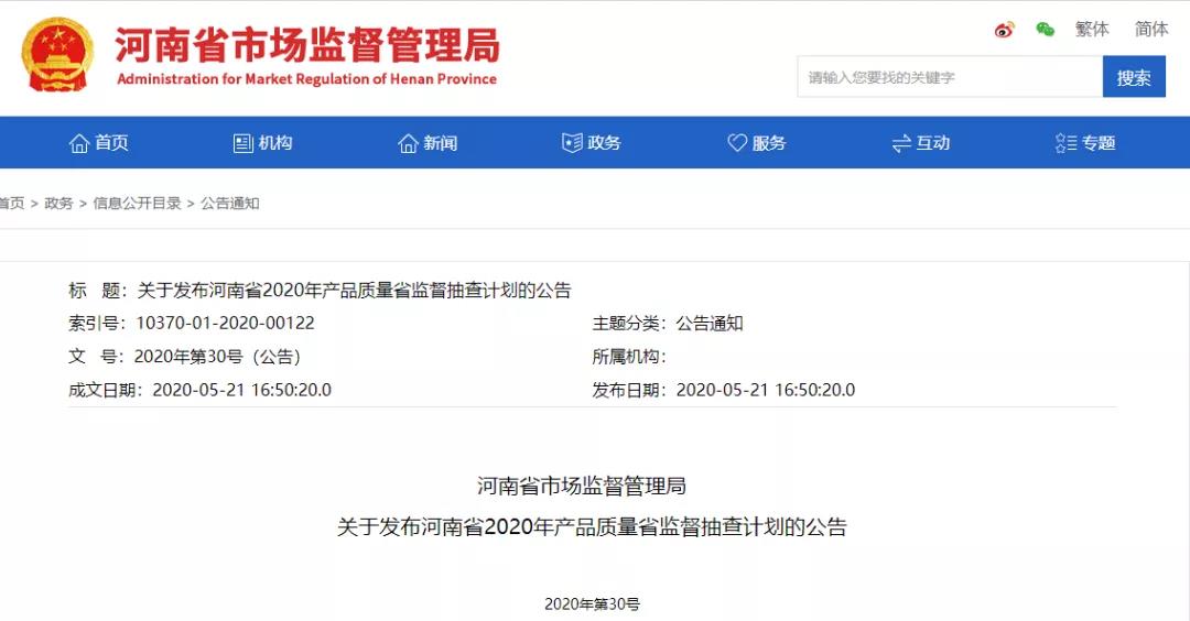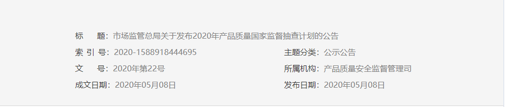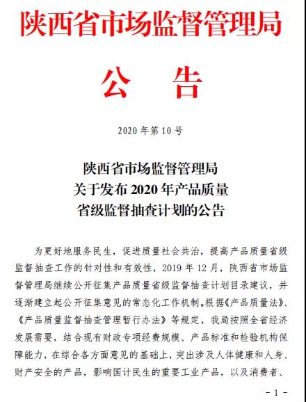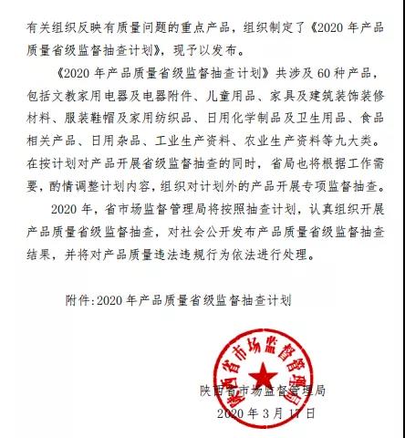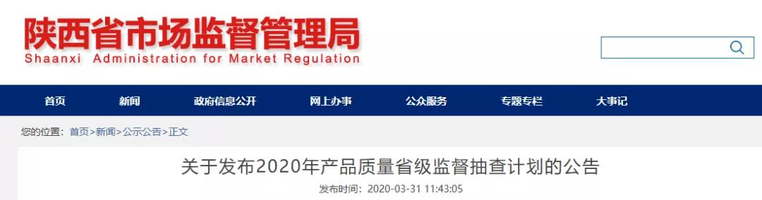 与此同时,湖北、陕西、河南等多个省市地区陆续下发了2020年产品质量国家监督抽查计划及细则。