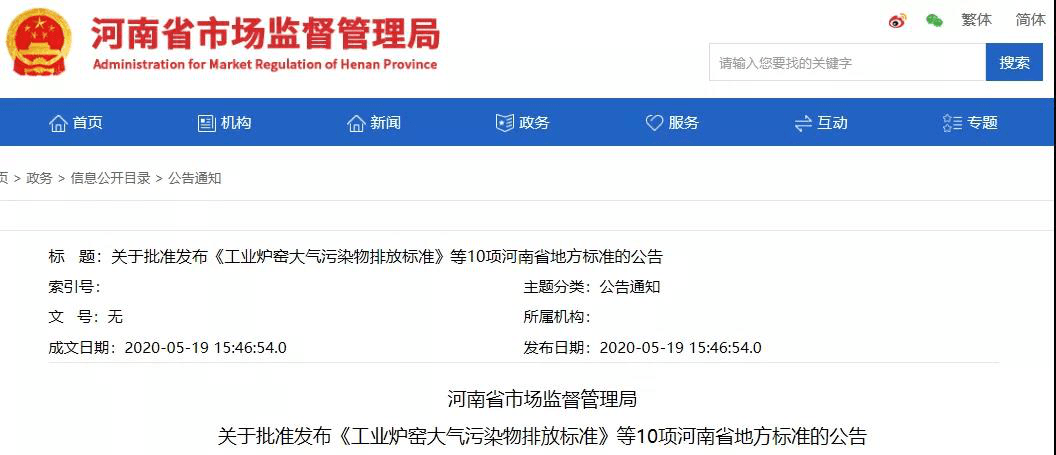 河南省市场监督管理局2020年29号公告批准发布新修订的《工业炉窑大气污染物排放标准》(DB41/1066-2020),自2020年6月1日起实施。