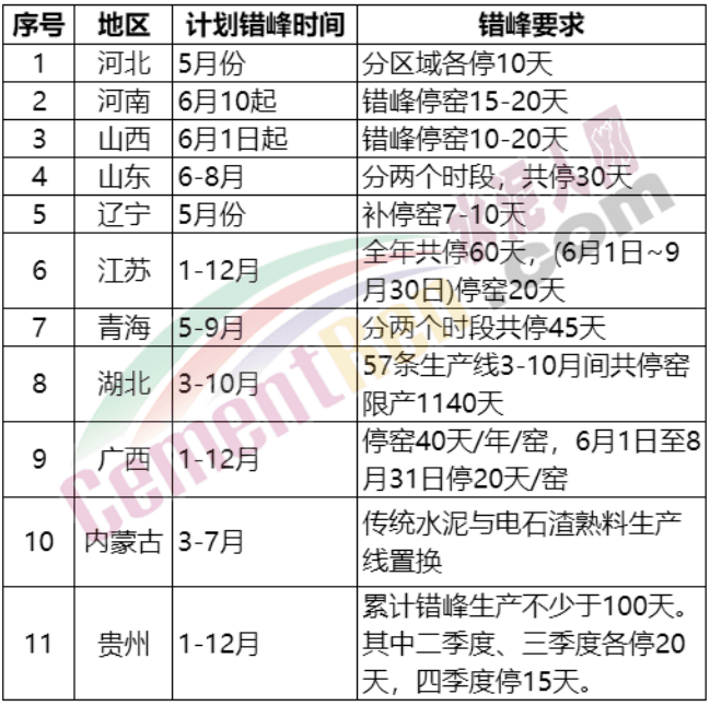 近日,山东、山西、河南省通知区域内水泥熟料生产线将于6月份开始错峰生产。江苏省通知熟料生产线于6月1日-9月30日停窑20天。广西壮族自治区水泥协会通知2020年6月1日至8月31日停20天/窑。