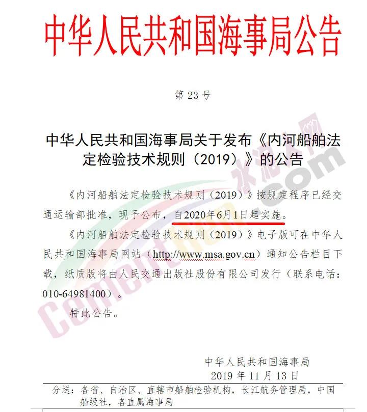 内河运输方面,针对内河船舶,交通运输部又一新规实行