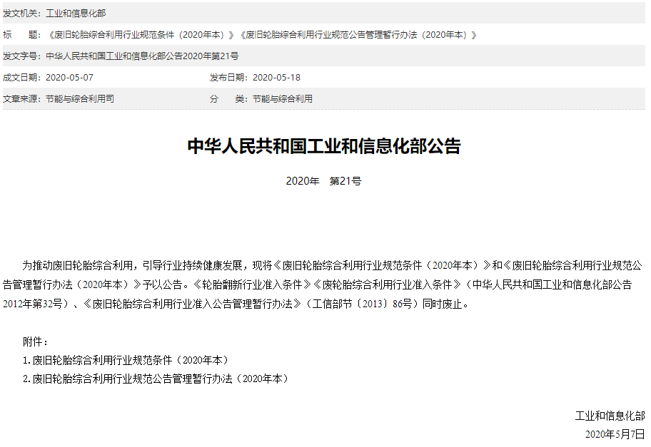 为推动废旧轮胎综合利用,引导行业持续健康发展,工业和信息化部日前公告《废旧轮胎综合利用行业规范条件(2020年本)》和《废旧轮胎综合利用行业规范公告管理暂行办法(2020年本)。