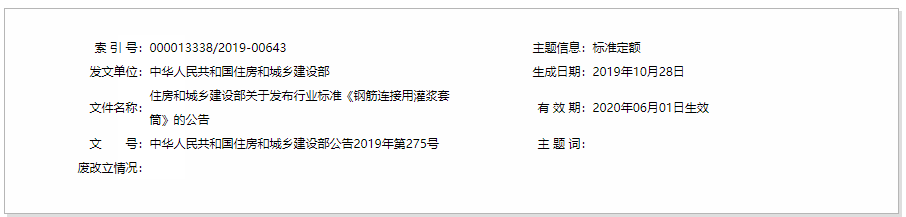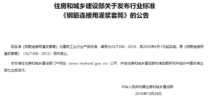 还有一件大事要关注:那就是住房和城乡建设部发布了关于《钢筋连接用灌浆套筒》的公告,批准由中国建筑科学研究院主编的《钢筋连接用套筒灌浆料》为建筑工业行业产品标准,编号为JG/T408-2019,自2020年6月1日起实施。
