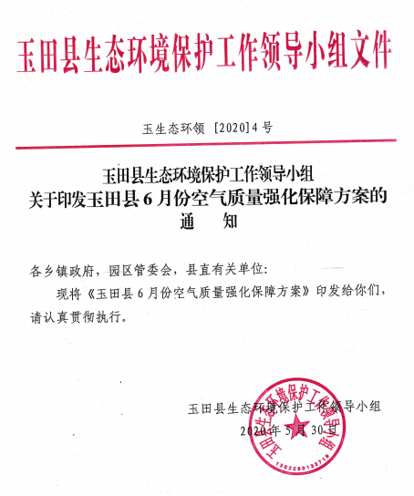 同期,唐山市玉田县生态环境保护工作领导小组了发布了6月份空气质量强化保障方案。