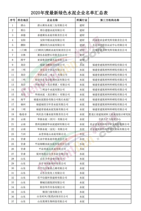 根据工信部《2020年工业节能与综合利用工作要点》要求和《工业和信息化部办公厅关于开展第五批绿色制造名单推荐及前两批名单复核工作的通知》(工信厅节函{2020}30号)要求,结合自省市绿色制造体系建设实施方案的相关要求。近期河北、河南、吉林、福建、山东聊城等地区工信厅公布了最新一批绿色制造体系,绿色制造体系包括了省绿色工厂、省绿色园区、省绿色供应链管理示范企业等相关水泥企业名单。