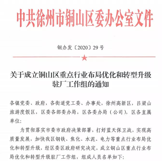 据水泥人网了解,近日江苏省徐州市铜山区人民政府发布《关于成立铜山区重点行业布局优化和转型升级驻厂工作组的通知》称,为贯彻落实市委市政府决策部署,打好蓝天保卫战,实现高质量发展,加快铜山区钢铁、焦化、水泥、电力等重点行业布局优化和转型升级,经区委区政府研究决定,成立铜山区重点行业布局优化和转型升级驻厂工作组。其中明确指出,淮海中联水泥工作组工作目标及任务包括:要落实在线监控,严禁恢复生产;2020年6月底前协助完成搬迁至贾汪区的项目前期手续。