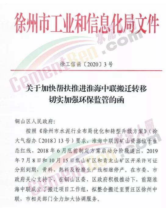 就是这样一家企业,被要求停产退出。并且在今年3月份,徐州市工信局为了进一步敦促淮海中联水泥尽快退出,徐州市工信局发布了《关于加快帮扶推荐淮海中联搬迁转移切实加强环保监管的函》称,要求相关部门严肃属地监管责任,组织有关部门立即调查,严防矿山资源非法启动开采,加大污染物在线监测和环境执法力度,切实加强区域道路运输监管,杜绝外购矿石、擅自复产等现象。