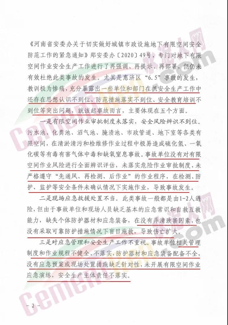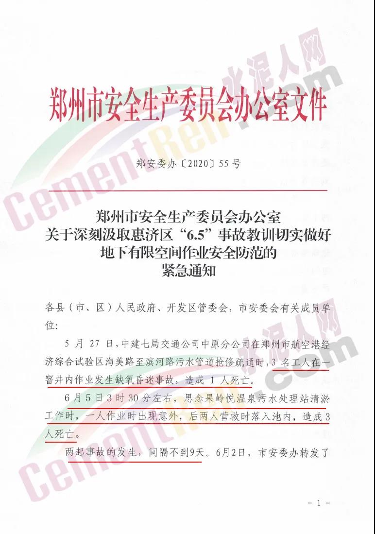 河南郑州应急管理局发布《关于深刻汲取惠济区“6.5”事故教训切实做好地下有限空间作业安全防范的紧急通知》(郑安委办〔2020〕55号)提到: