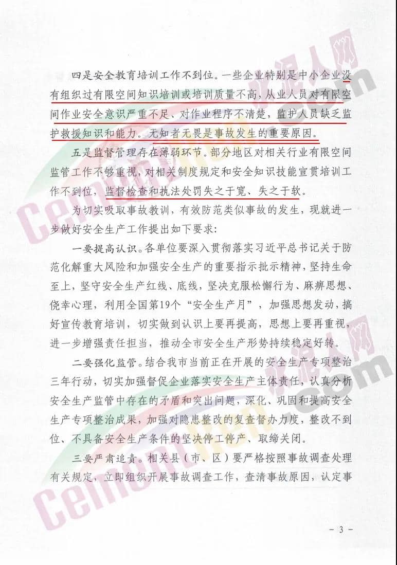 省安委办关于迅速开展有限空间作业安全生产专项治理工作的通知称,事故发生后,省领导批示指出,针对有限空间安全防范多次要求但事故屡禁不止,要严格按“四不放过”原则彻底调查,并专门就此类事故防范展开督查,督促各有关企业制定专项安全方案,切实把事故率、死亡率降低下来。