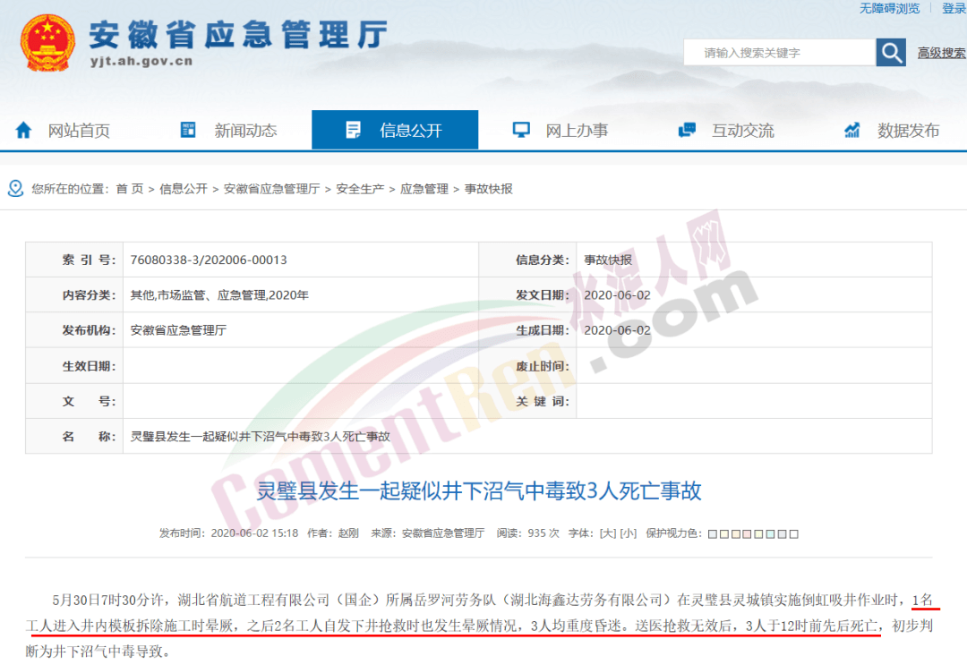 据安徽省应急管理厅网站消息,5月30日,灵璧县发生一起疑似井下沼气中毒致3人死亡事故。5月30日7时30分许,湖北省航道工程有限公司(国企)所属岳罗河劳务队(湖北海鑫达劳务有限公司)在灵璧县灵城镇实施倒虹吸井作业时,1名工人进入井内模板拆除施工时晕厥,之后2名工人自发下井抢救时也发生晕厥情况,3人均重度昏迷。送医抢救无效后,3人于12时前先后死亡,初步判断为井下沼气中毒导致。