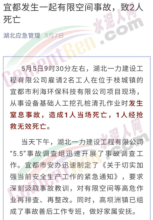 湖北省应急管理厅官方微信发布消息:2020年5月5日9时30分左右,湖北一力建设工程有限公司雇请2名工人在位于枝城镇的宜都市利海环保科技有限公司项目现场,从事设备基础人工挖孔桩清孔作业时发生窒息事故,造成1人当场死亡,1人经抢救无效死亡。