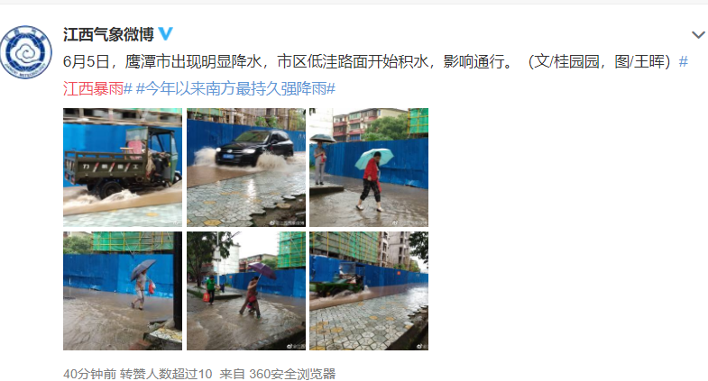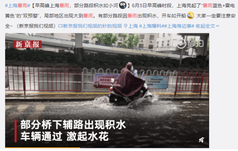 江苏南部、上海、浙江大部、安徽南部、江西中南部、福建西北部、湖南中南部、广西中北部、广东北部、贵州南部等地部分地区有大到暴雨,其中浙江西南部、江西东北部、广西北部等地局地有大暴雨。6月5日早高峰时段,上海亮起了“暴雨蓝色+雷电黄色”的“双预警”,局部地区出现大到暴雨。有部分路段因暴雨出现积水,开车如开船。