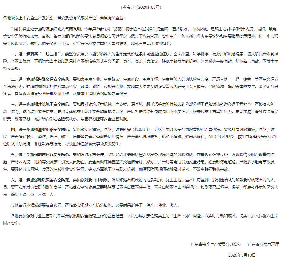 6月13日,广东省安委办、省应急管理厅就进一步加强汛期安全防范工作发出通知,要求各地、各有关部门和单位要进一步加强安全风险研判,做好汛期安全防范工作,各地要加强对行业主管部门部署开展汛期安全防范工作的监督检查,牢牢守住不发生重特大事故底线。