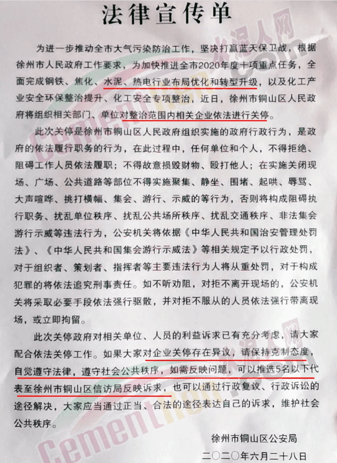 同期,徐州铜山区茅村派出所将一份28日发布的《法律宣传单》送到淮海中联工厂。宣传单中提到为进一步推动全市大气污染防治工作,坚决打高蓝天保卫战,根据徐州市人民政府工作要求,为加快推进全市2020年度十项重点任务,全面完成钢铁、焦化、水泥、热电行业布局优化和转型升级,以及化工产业安全环保整治提升、化工安全专项整治。近日,徐州市铜山区人民政府将组织相关部门、单位对整治范围内相关企业依法进行关停。