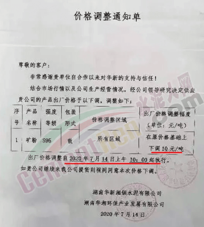 华东某矿粉经销商表示,随着水泥和熟料价格的下调,矿粉价格也随之降低10-20元/吨。同期,华中大厂华新湘钢水泥通知结合市场行情及公司营销情况,经公司研究决定自7月14日起下调S95矿粉价格10元/吨。