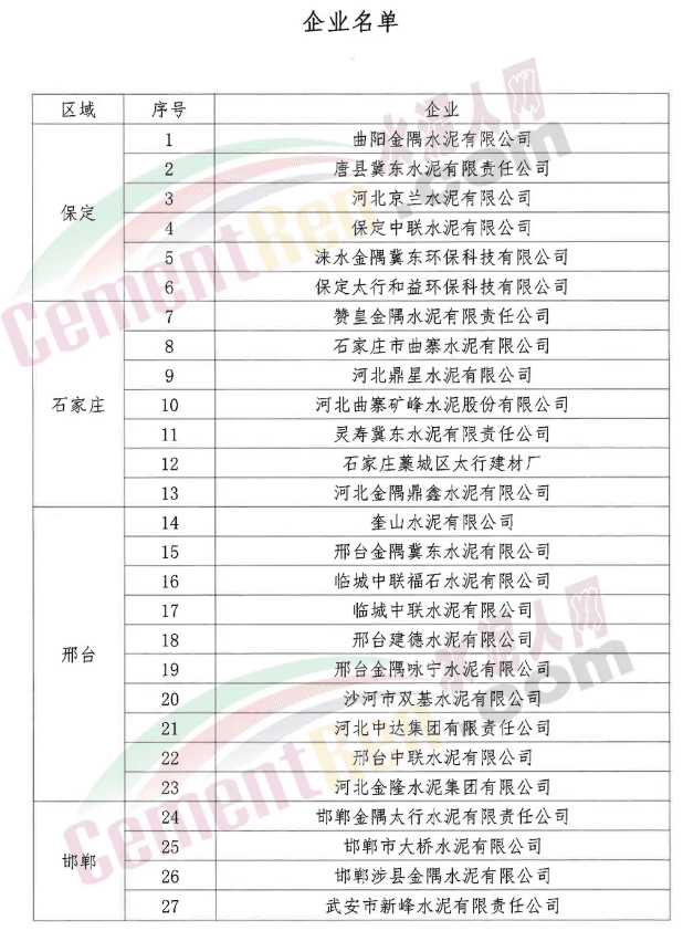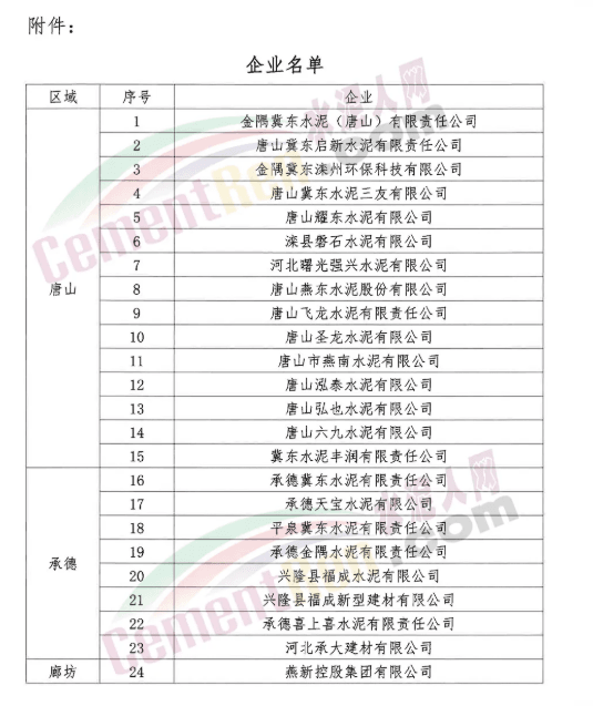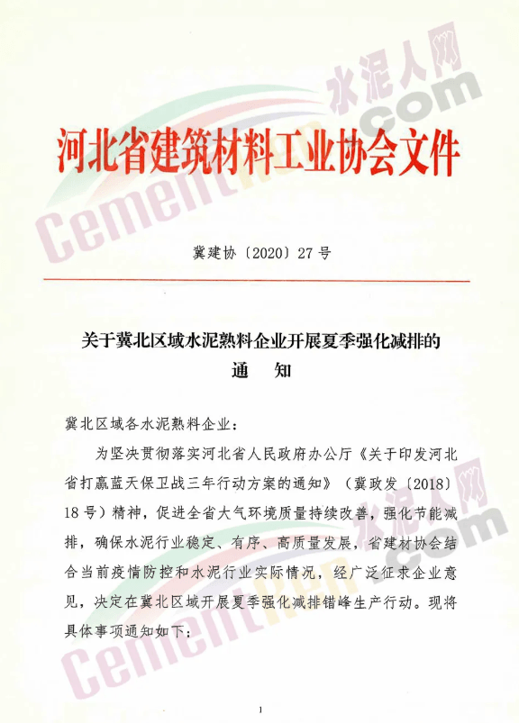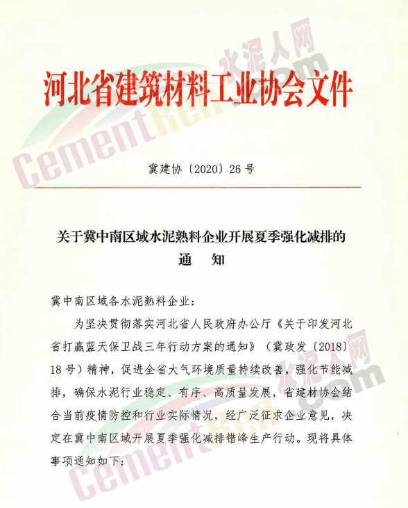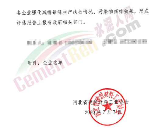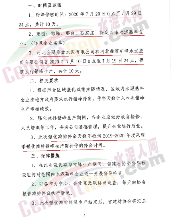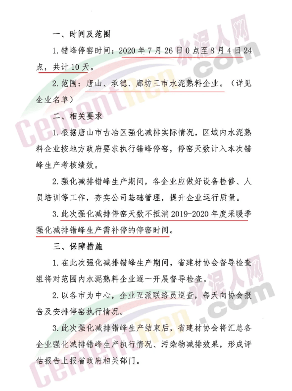 邯郸、邢台、石家庄、保定四市水泥熟料企业从2020年7月20日0时至7月29日24时,共停10天。其中,河北金隅鼎鑫水泥有限公司和河北曲寨矿峰水泥股份有限公司已于2020年7月10日0时至7月19日24时,提前执行错峰生产,共计10天;根据邢台区域强化减排实际情况,区域内水泥熟料企业按地方政府要求执行错峰停窑,停窑天数计入本次错峰生产考核绩效。原文件如下: