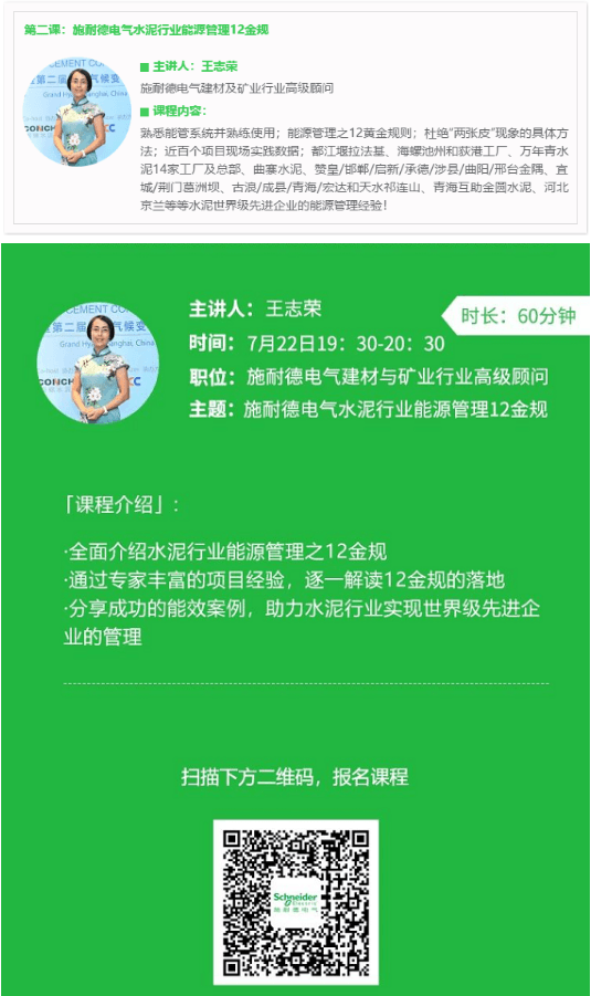 今天晚上,施耐德电气为大家准备了关于能源管理的“葵花宝典”,主讲人为施耐德电气建材与矿业行业高级顾问王志荣老师,通过10年近百余个项目的亲身经历,结合全球最先进的能源管理系统与一流水泥工厂的完美融合,精准阐述以下问题:如何做到吨熟料标煤耗下降一公斤以上,工序电耗下降0.7度以上,熟料游离氧化钙标准偏差下降10%以上?怎么杜绝“两张皮”,实现能源管理过程可视可控,系统在线率高达99%以上?同样是水泥厂,别人家怎那么做到了年降低电费近500万?