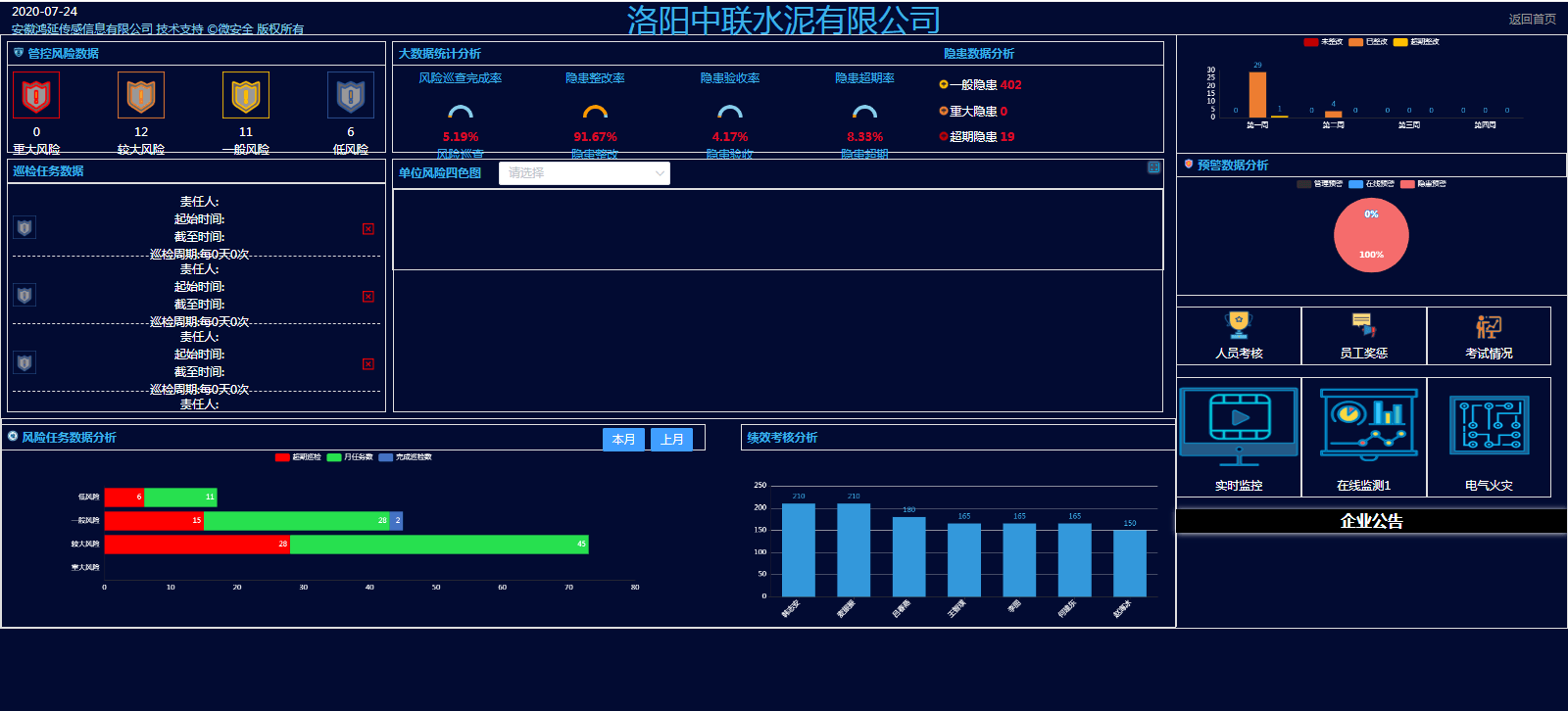 洛阳中联自建厂以来,高度重视安全工作,先后投入大量的资金和人力,不断完善公司的安全生产管理体系。2018年7月份以来,随着《河南省安全生产监督管理局关于开展我省工贸行业企业安全风险评估诊断分级的通知》和《河南省企业风险分级管控隐患排查治理双重预防指导手册》两份文件的先后下发,洛阳中联积极响应上级指示精神,开始于2019年3月份,依托公司的智能化平台,正式着手构建洛阳中联信息化双重预防机制。