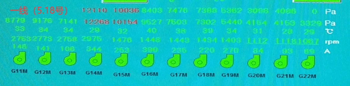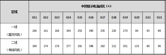 对比当天两条线12台篦冷风机运行电流可见,在一线熟料产量高于二线的前提下,一线仅有G14风机实际运行电流明显高于二线(设计全压比二线高1000Pa),G18、G21两台风机电流稍高,但在波动范围内,其余9台风机运行电流均比二线对应风机电流低。中控显示12台风机运行电流一线篦冷风机较二线篦冷风机低230A以上。