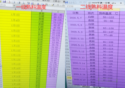 除了对比两条线风机运行能耗,工程技术人员还对比了5月份两条线正常运行后在相同位置测得的熟料温度,一线熟料温度大约50-90℃,二线熟料温度大约60-120℃,一线熟料温度明显低于二线孰料温度,可见一线冷却效果好于二线,见下图。