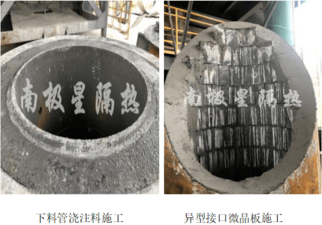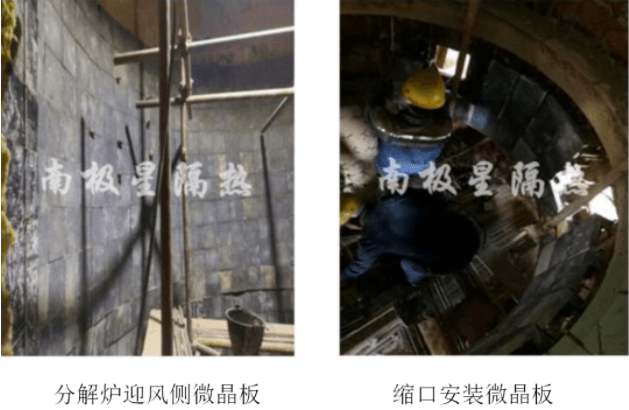 在国内的水泥厂中,南极星先后在分解炉正对三次风管进风口、椎体、缩口、烟气室和五级下料管等处,采用了ZAS微晶陶瓷板,详细见下面的施工图片。
