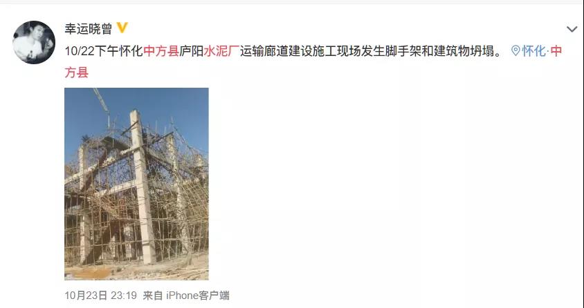 来自新浪微博网友消息称:10月22日下午怀化中方县泸阳水泥厂运输廊道建设施工现场发生脚手架和建筑物坍塌。