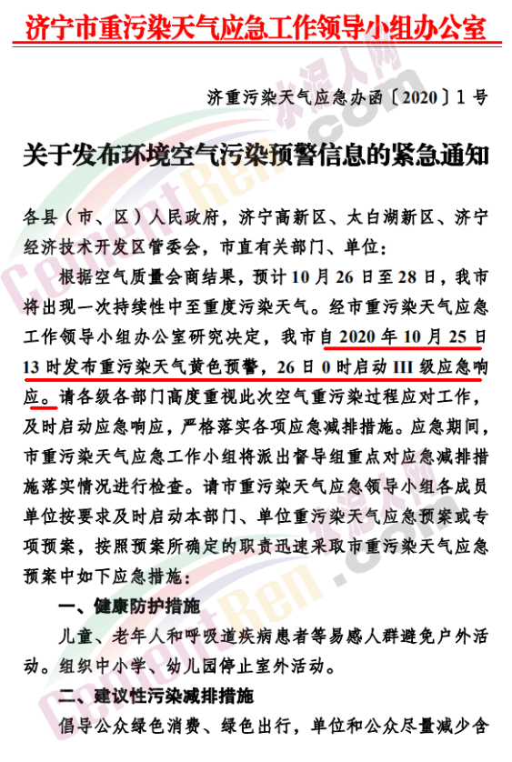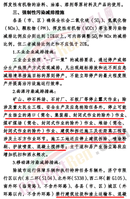 要求工业企业按照“一厂一策”的减排要求,通过停产或部分生产线限产方式实现减排,凡出现超标排放和达不到应急减排清单措施目标的原则停产,不能立即停产的最大程度限产并提高治污设施运行效率。矿山、砂石料场、石材厂、石板厂等停止露天作业;除涉及重大民生工程、安全生产及应急抢险任务外,停止可能产生扬尘的港口作业、煤矿煤场作业、堆场作业、建筑和拆迁施工及长距离工程等涉及土石方作业环节,施工工地还应停止建筑拆除、喷涂粉刷、护坡喷浆、混凝土搅拌等。除城市运行保障车辆和执行特种任务车辆外,济宁市限行区以内禁行建筑垃圾和渣土运输车、混凝土罐车、砂石运输车等中型和重型载货汽车。全市范围内未安装密闭装置易产生遗撒的煤炭、渣土、砂石料等运输车辆应停止上路。对未按国家、省要求落实应急措施和未纳入应急减排清单的涉气企业,重污染应急期间实施停产。通知原文如下: