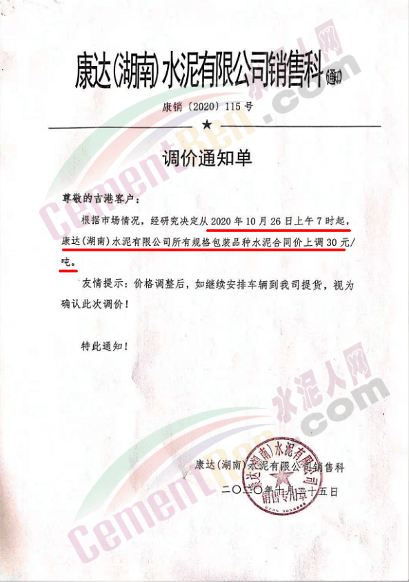 红狮水泥旗下康达(湖南)水泥有限公司销售科通知,自今日(10月26日)上午7时起,所有规格包装品种水泥合同价上调30元/吨。
