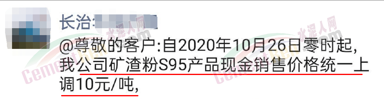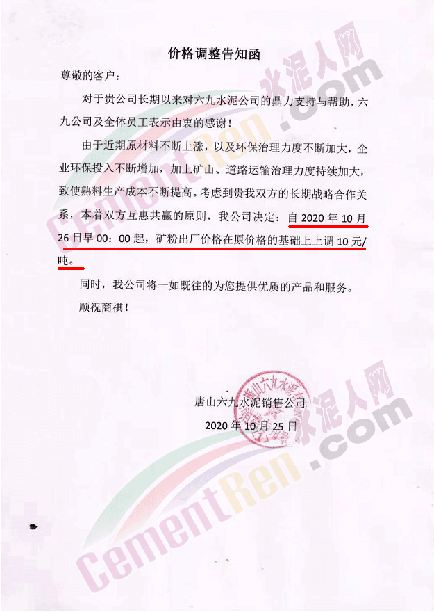 唐山六九水泥销售公司通知,由于近期原材料不断上涨,环保治理力度不断加大,企业环保投入不断增加,加上矿山、道路运输治理力度持续加大,致使熟料生产成本不断提高。自2020年10月26日0时起,矿粉出厂价格在原价格的基础上上调10元/吨。