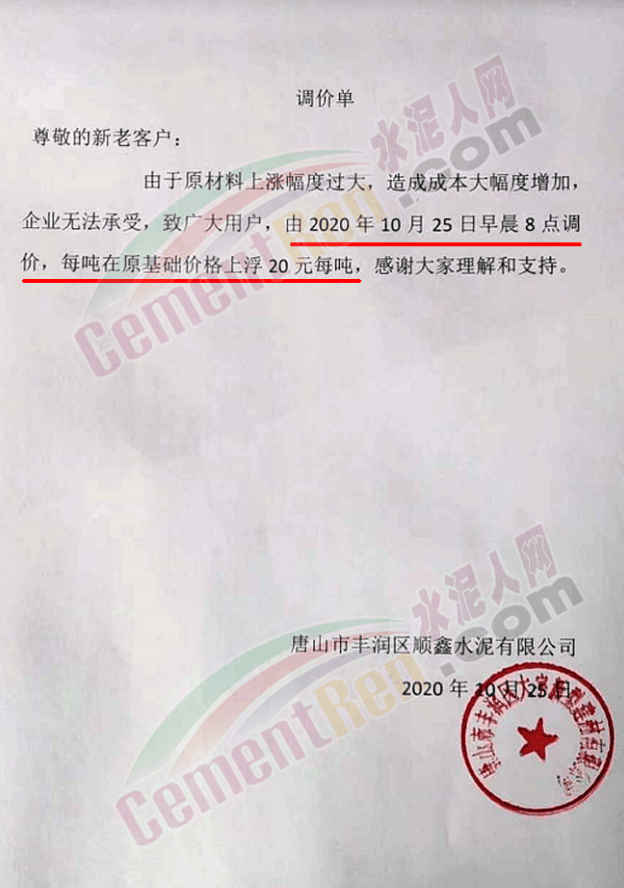 唐山市丰润区顺鑫水泥有限公司通知,由于原材料上涨幅度过大,造成成本大幅度增加,企业无法承受。自10月25日早8点起,水泥价格上浮20元/吨。