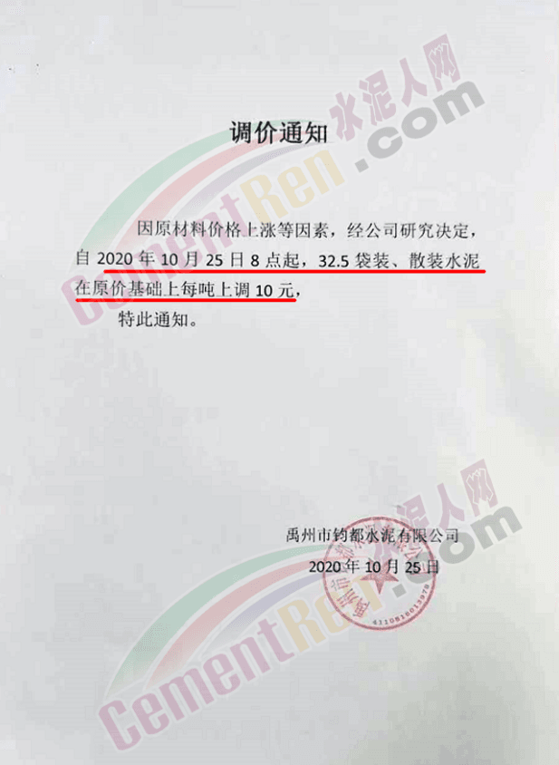 禹州市钧都水泥通知,因原材料价格上涨等因素,自10月25日8点起,32.5袋装、散装水泥在原价基础上每吨上调10元。