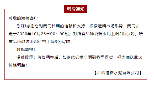 广西港桥水泥有限公司通知,根据近期市场形势,决定于2020年10月26日0时起,对所有品种袋装水泥上调20元/吨,所有品种散装水泥价格上调30元/吨。