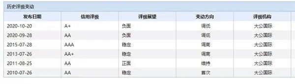 今年7月开始,债券存量规模高达175亿的华晨集团陷入风波。8月26日、27日,大公国际和东方金诚先后将华晨集团及其多只债券列入评级观察名单。9月29日,东方金诚和大公国际在同一天调低了华晨集团的主体信用评级——东方金诚调低至AA+,大公国际直接调低至AA。10月16日,东方金诚再次将华晨集团的主体信用评级调低至AA-。10月21日,大公国际则将华晨集团主体信用评级调低至A+。