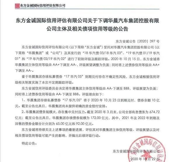 大公表示,按照2017年9月华晨集团与债权投资计划受托人太平资产管理有限公司签署的《太平一一华晨汽车制造产业升级债权投资计划投资合同》约定,华晨集团应于2020年9月21日划拨季度应付利息。截至2020年10月14日,华晨集团仍未将应付季度利息划拨至债权投资计划托管人账户。而东方金诚很罕见的在债券违约当天就挂出了评级下调公告,华晨集团的主体信用评级再一次断崖式下跌至BBB。