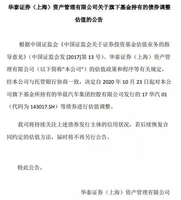 华泰证券资管称公告称,公司决定自 2020 年 10 月 23 日起对旗下基金所持有的华晨汽车集团控股有限公司发行的 17 华汽 01(代码为 143017.SH)等债券进行估值调整。