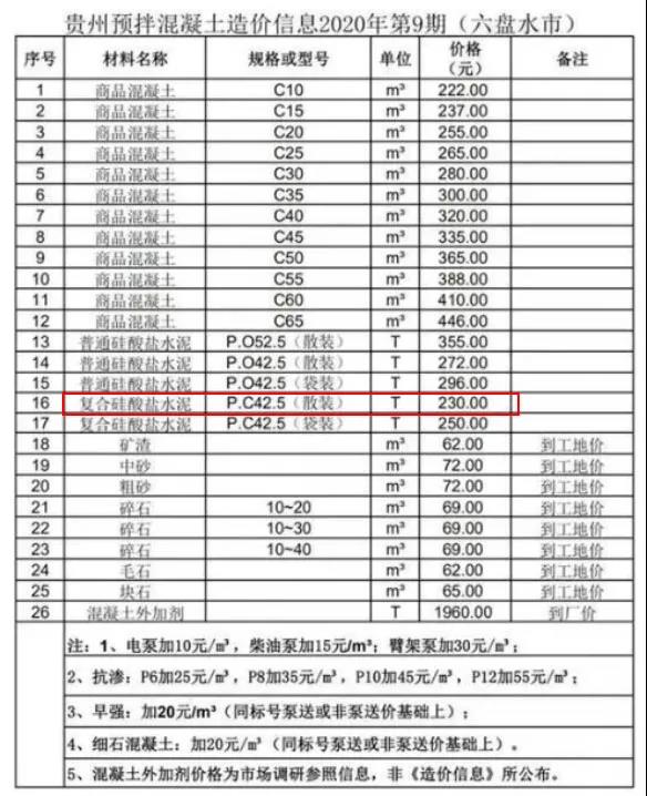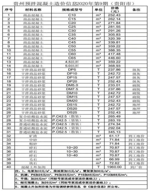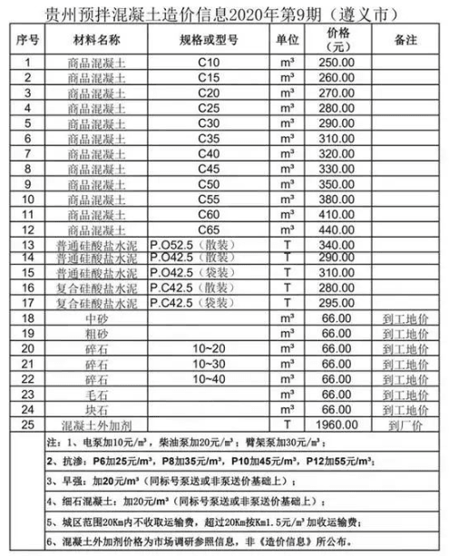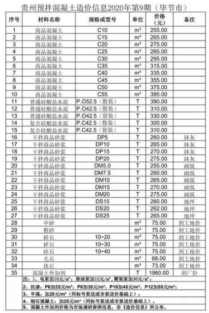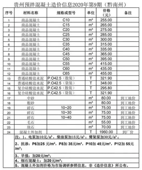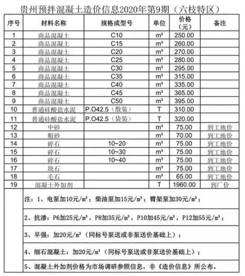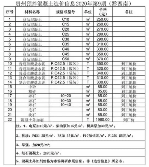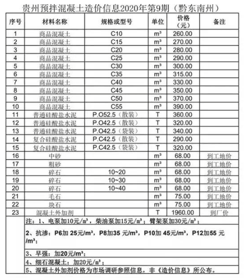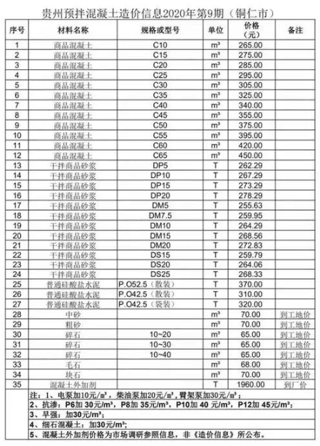 近日,贵州省预拌混凝土行业协会发布了贵州省预拌混凝土造价信息2020年第9期。造价信息显示,商品混凝土平均价格高于干拌商品砂浆、硅酸盐水泥等其他预拌混凝土。其中,黔南州商品混凝土C65价格最高,为455元/立方;黔南州毛石价格最低,为55元/立方。