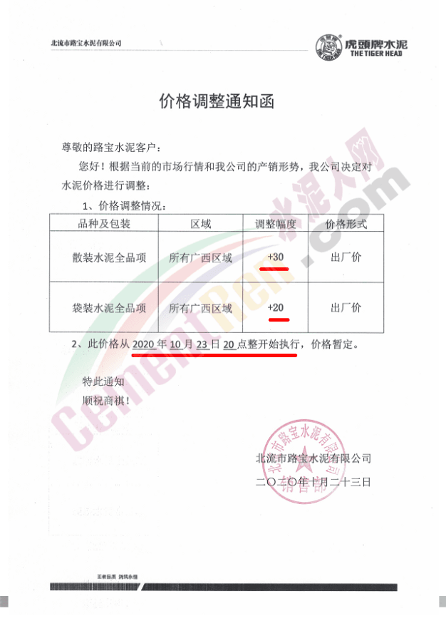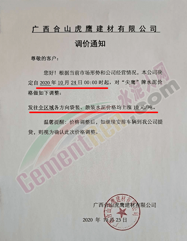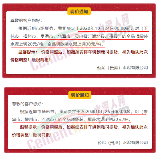 台泥(贵港)水泥有限公司通知于2020年10月24日00:00起,对(玉林市,梧州市,贵港市,北海市、灵山县、浦北县、横县)的全品项袋装水泥上调20元/吨、全品项散装水泥上调30元/吨;于2020年10月26日00:00起,对(来宾市,柳州市,河池市)的全品项袋装、散装水泥上调20元/吨。