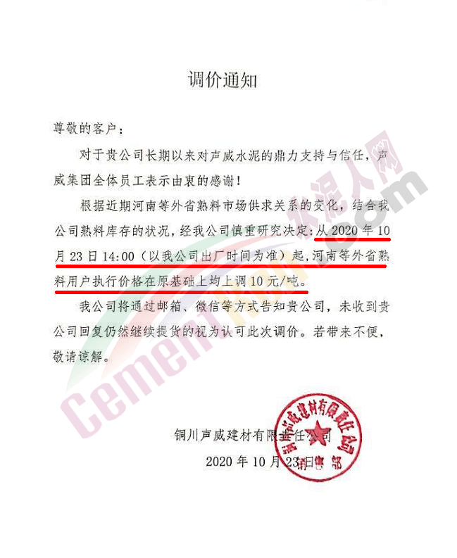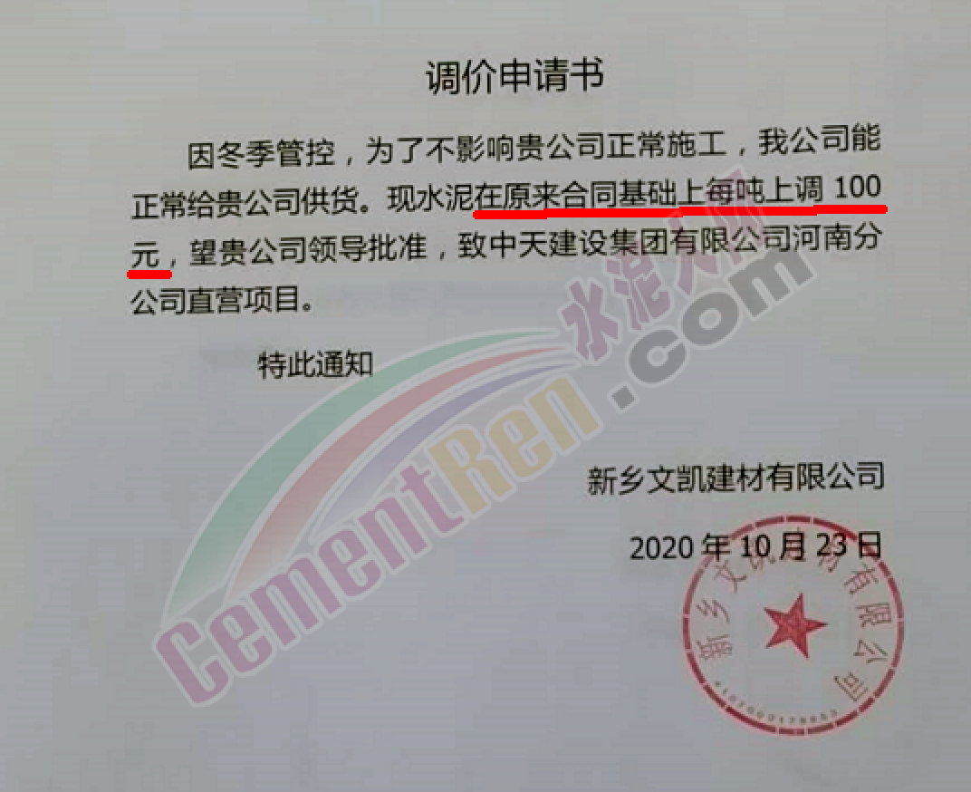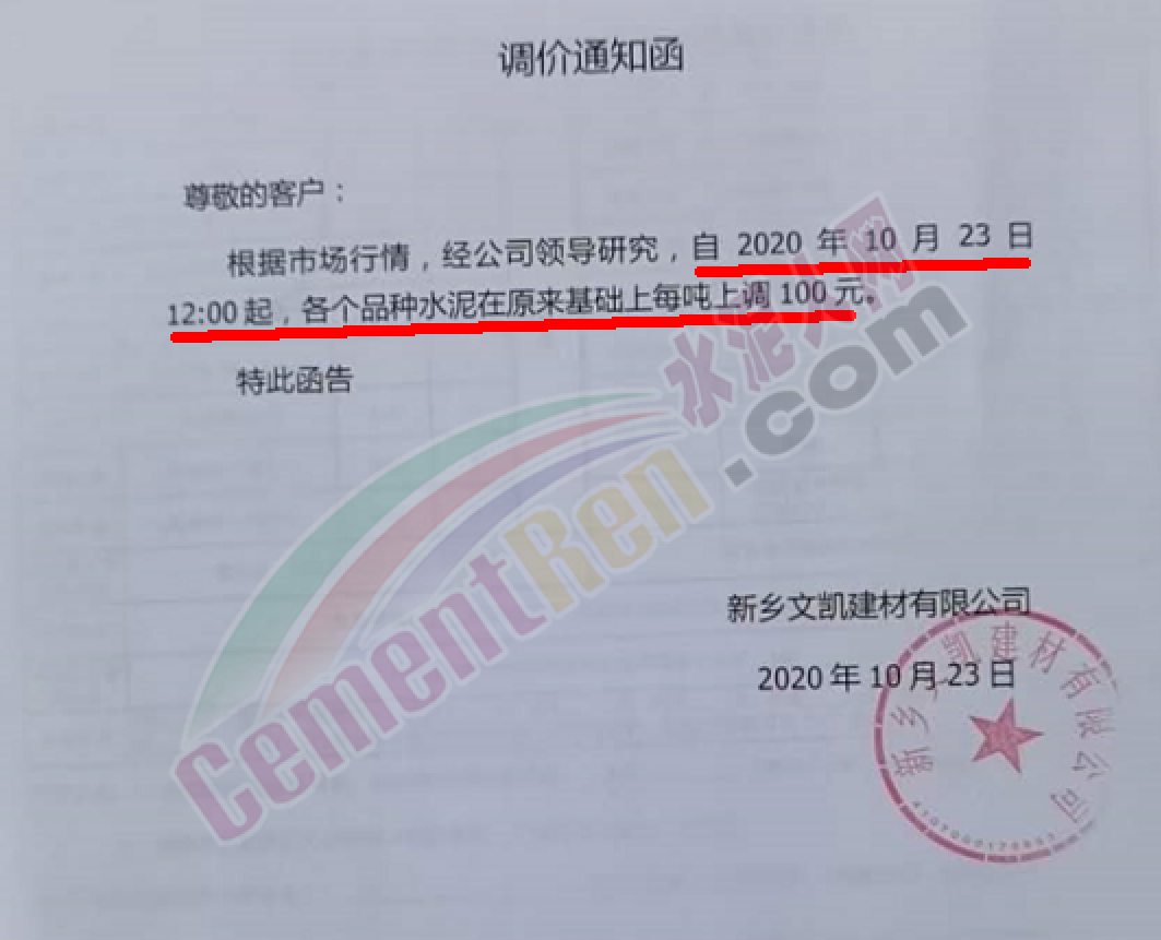 水泥人网通讯员消息,因重污染天气临停影响,河南多区域水泥企业通知价格上调,10月22日~23日郑州、新乡、许昌、驻马店、安阳、禹州、登封等地陆续通知上调高标水泥价格30元/吨。目前区域内多数熟料线停窑检修,管控加强后,水泥生产受限,库存下滑,周边区域有意陆续跟进上调。新乡区域水泥经销企业新乡凯文建材有限公司通知因冬季管控,水泥在原合同基础上每吨上调100元。