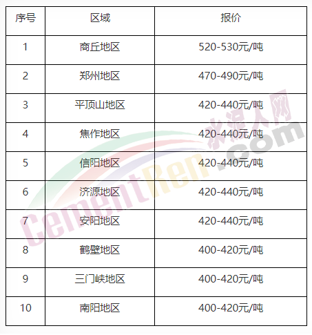 河南部分区域PO42.5散装水泥出厂报价如下:
