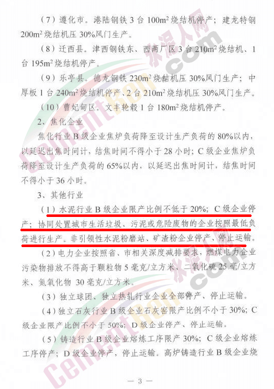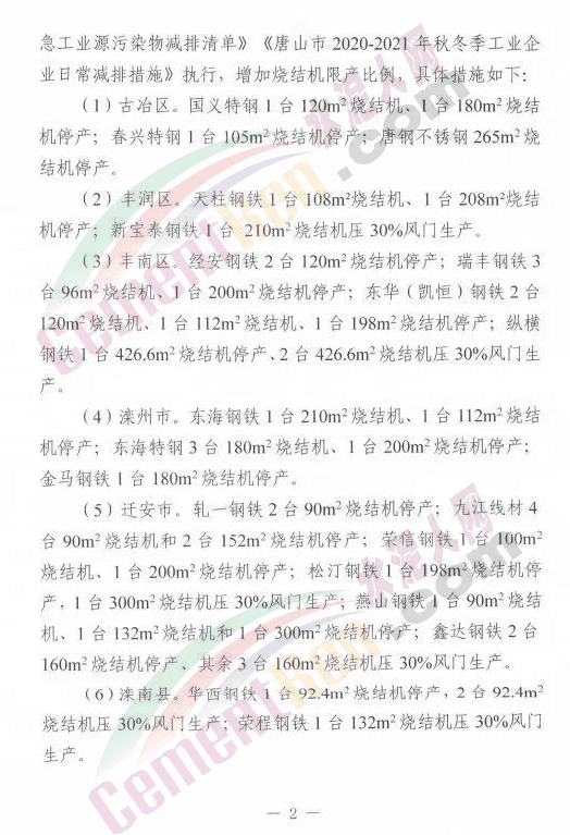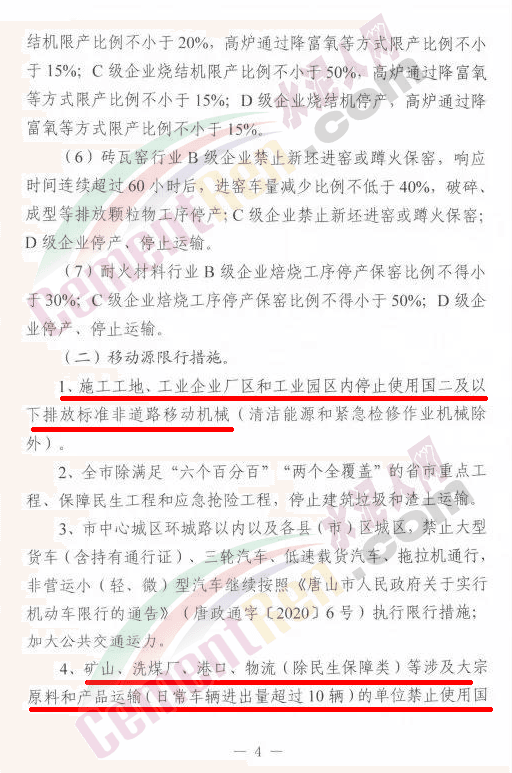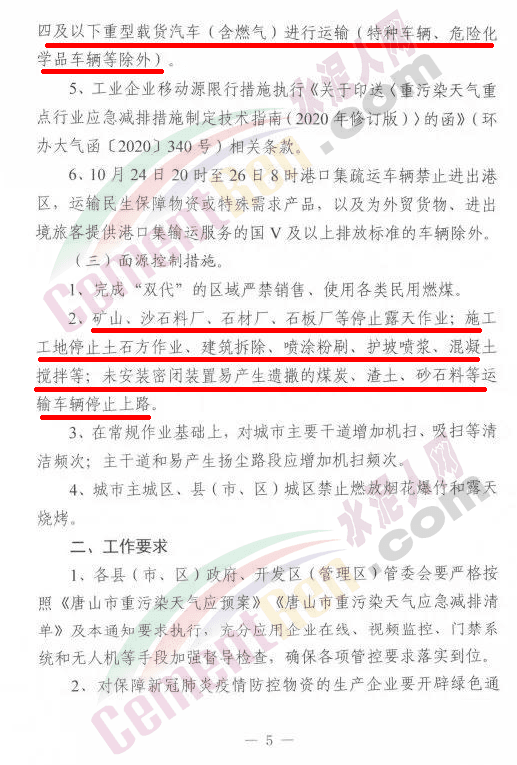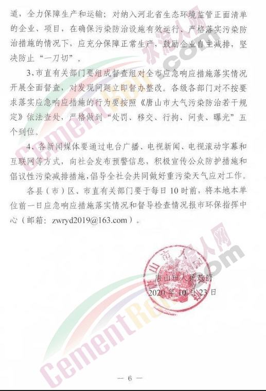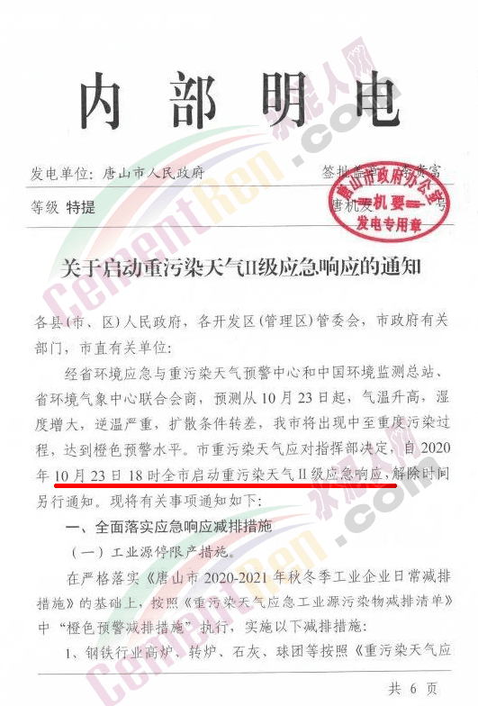 日前,唐山市人民政府发布特提等级文件《关于启动重污染天气II级应急响应的通知》称,自2020年10月23日18时全市启动重污染天气II级应急响应,解除时间另行通知。工业源停限产措施,要求在严格落实《唐山市2020-2021年秋冬季工业企业日常减排措施》的基础上,按照《重污染天气应急工业源污染物减排清单》中“橙色预警减排措施”执行。水泥行业B级企业限产比例不低于20%;C级企业停产;协同处置城市生活垃圾、污泥或危险废物的企业按照最低负荷进行生产。非引领性水泥粉磨站、矿渣粉企业停产、停止运输。施工工地、工业企业厂区和工业园区内停止使用国二及以下排放标准非道路移动机械(清洁能源和紧急检修作业机械除外)。 全市除满足“六个百分百”“两个全覆盖”的省市重点工程、保障民生工程和应急抢险工程,停止建筑垃圾和渣土运输。矿山、洗煤厂、港口、物流(除民生保障类)等涉及大宗原料和产品运输(日常车辆进出量超过10辆)的单位禁止使用国四及以下重型载货汽车(含燃气)进行运输(特种车辆、危险化学品车辆等除外)。工业企业移动源限行措施执行《关于印送〈重污染天气重点行业应急减排措施制定技术指南(2020年修订版)〉的函》(环办大气函〔2020〕340号)相关条款。10月24日20时至26日8时港口集疏运车辆禁止进出港区,运输民生保障物资或特殊需求产品、以及为外贸货物、进出境旅客提供港口集输运服务的国V及以上排放标准的车辆除外。矿山、沙石料厂、石材厂、石板厂等停止露天作业;施工工地停止土石方作业、建筑拆除、喷涂粉刷、护坡喷浆、混凝土搅拌等;未安装密闭装置易产生遗撒的煤炭、渣土、砂石料等运输车辆停止上路。各县(市、区)政府、开发区(管理区)管委会充分应用企业在线、现频监控、门票系统和无人机等手段加强督导检查,确保各项管控要求落实到位。市直有关部门要爼成督查组对全市应急响应措施落实情况开展全面督查,对发现问题立即督办整改。各级各部门对不按要求落实应急响应措施的行为要按照《唐山市大气污染防治若干规定》依法查处,严格做到“处罚、移交、行拘、问责、曝光”五个到位。文件原文如下: