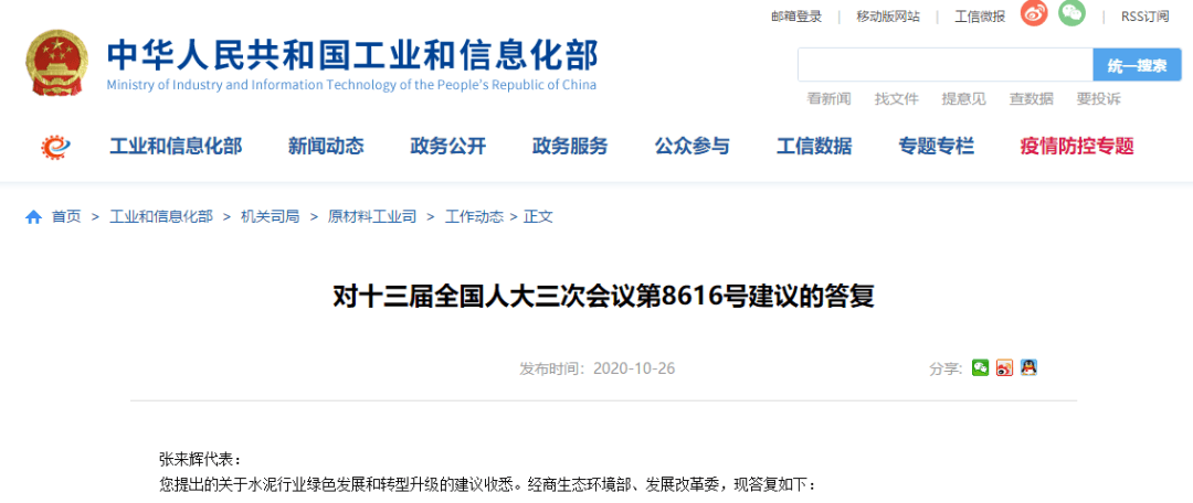 一是关于将水泥移出高污染高耗能名录。高耗能行业是从统计角度对能耗总量占比前六位的工业行业大类的惯用说法,是宏观分析使用口径,主要用于宏观经济分析,并非正式的统计分类标准。近年来水泥行业节能减排、绿色发展成效显著,我们将加强与宏观部门、统计部门的沟通,推动调整相关分类工作,在实际工作中也会根据行业发展情况制定更为精准科学的产业政策。二是关于出台水泥行业转型升级规划,拟研究制定《原材料工业“十四五”发展规划》,包括水泥行业转型升级相关内容,继续大力推动水泥行业绿色发展和智能制造,提高水泥行业全产业链节能减排水平,建立与各类固体废弃物及危险废弃物排放紧密衔接的循环经济生产体系,提高综合处置能力和利用效率,推进绿色矿山建设,全面推进水泥智能制造数字转型,促进行业高质量发展。三是关于利用水泥窑协同处置固体废物,近年来生态环境部先后印发《水泥窑协同处置固体废物污染控制标准》《水泥窑协同处置固体废物环境保护技术规范》《水泥窑协同处置固体废物经营许可证审查指南(试行)》《水泥窑协同处置固体废物污染防治技术政策》等文件,基本建立了水泥窑协同处置的环境保护法规标准体系,明确水泥窑协同处置固体废物应作为城市固体废物处置的重要手段。发展改革委发布《产业结构调整指导目录(2019年本)》,将利用不低于2000吨/日新型干法水泥窑生产线协同处置废弃物等列入鼓励类。目前,水泥窑协同处置危险废物能力超4000万吨/年,相比2016年增长超过1倍。下一步,我部将会同有关部门继续加强水泥窑协同处置固体废物工作,完善相关标准规范,提升关键技术装备水平,拓宽水泥窑协同处置渠道,指导各地合理规划布局水泥窑协同处置项目,实现废弃物资源化、无害化处理,保护好生态环境。