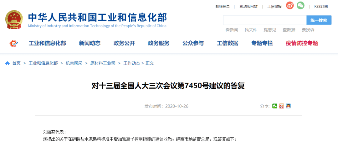 混凝土的质量控制与原材料(水泥、粗细骨料、矿物掺和料、外加剂、水等)的质量控制、施工(配合比、搅拌、成型、养护)工艺控制等因素有关。为此,国家在混凝土质量控制标准、混凝土结构设计规范、混凝土结构工程施工质量验收规范等标准规范中都对混凝土中氯离子含量进行了规定,在通用硅酸盐水泥标准中也专门规定了氯离子指标。针对您的建议,我部将指导和推动水泥标准化组织在硅酸盐水泥熟料标准修订中增加氯离子控制指标,具体指标是否设定为≤0.10%,可由起草单位会同有关专家研究确定。同时我部将加强对水泥熟料及水泥质量的监管,鼓励产品销售和购买双方对氯离子的含量进行严格检验,以确保满足相关质量要求。