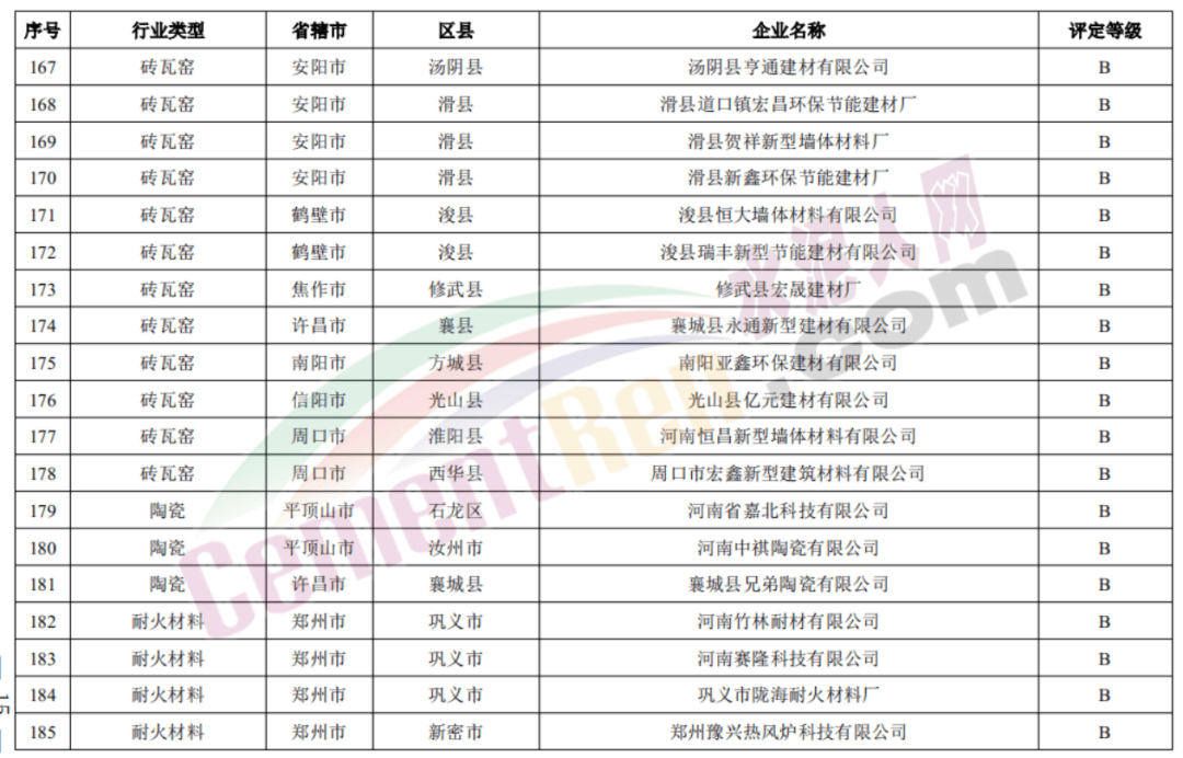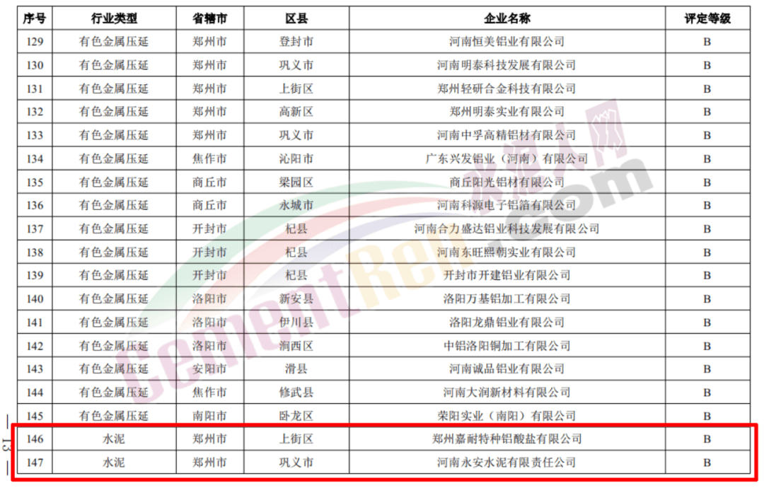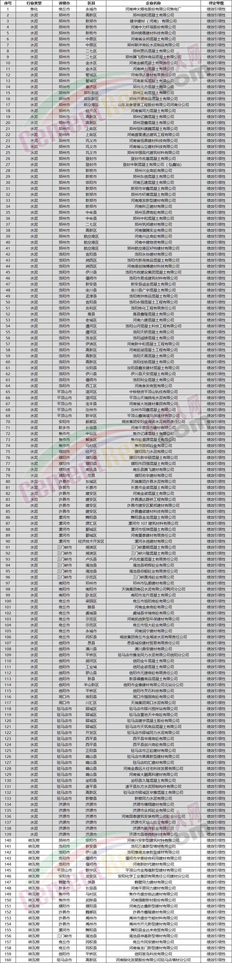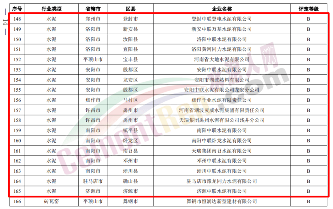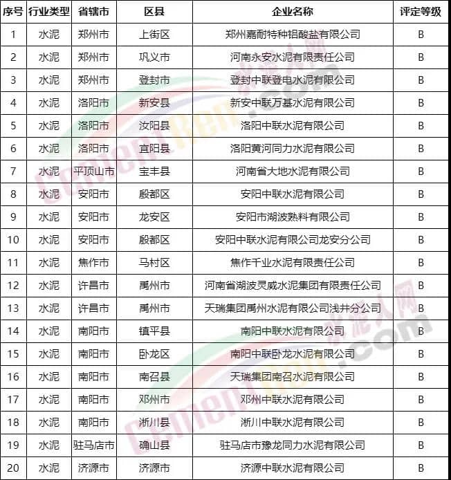 包括登封中联、新安中联、洛阳中联、济源中联、邓州中联、淅川中联、南阳中联、安阳中联、安阳湖波、大地水泥等20家企业获评B级。
