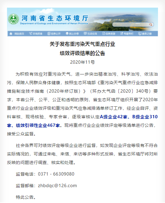 日前,河南省生态环境厅发布《关于发布重污染天气重点行业绩效评级结果的公告》称,为积极有效应对重污染天气,进一步突出精准治污、科学治污、依法治污,保障人民群众身体健康,按照生态环境部《重污染天气重点行业应急减排措施制定技术指南(2020年修订版)》(环办大气函〔2020〕340号)要求,本着公开、公平、公正和透明的原则,河南省生态环境厅组织开展了2020年重点行业企业绩效评级和重污染天气应急减排清单修订工作,经企业自评、资料审核、现场核验、专家会审,逐级审核认定A级企业42家、B级企业310家、绩效引领性企业467家。