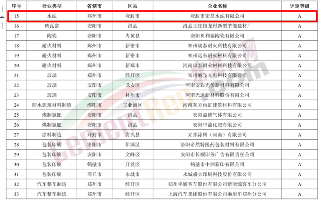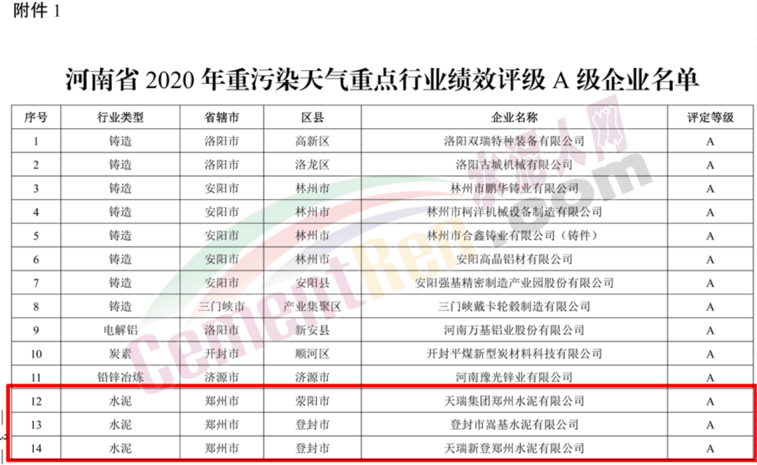 其中郑州登封市四家水泥企业获评A级企业,分别为天瑞集团郑州水泥有限公司、登封市嵩基水泥有限公司、天瑞新登郑州水泥有限公司、登封市宏昌水泥有限公司。