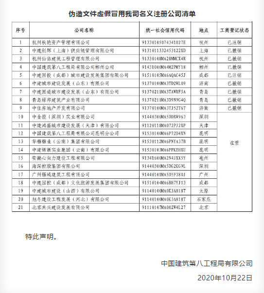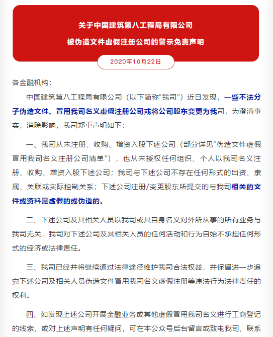 日前,中国建筑第八工程局又发布公告,又有不少人伪造文件、冒用其名义虚假注册公司,或变更其为公司股东!