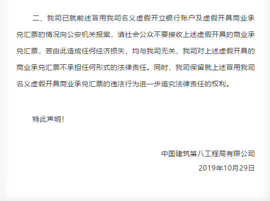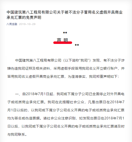 据水泥人网了解,早在2019年,中国建筑第八工程局就发布过被假冒商票的声明!