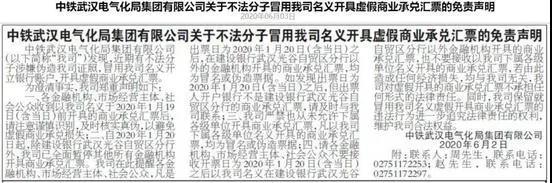 作为一家世界500强企业,中铁武汉电气化局集团有限公司(下称“中铁武汉”)被蹭了名气。6月初,中铁武汉对外公开发布免责声明,称近期发现不法分子涉嫌伪造该司证照,冒用其名义开立银行账户,开具虚假商业承兑汇票。